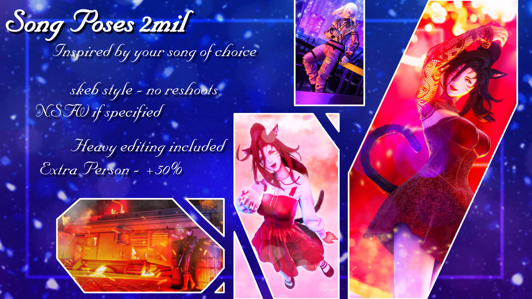 Skeb style projects with no direction other than a provided outfit and song. Song must be made availiable for me to listen to for free.Heavy editing and high complexity posing are included by default. If specified beforehand, the pose can be NSFW.This service does not allow for reshoots.