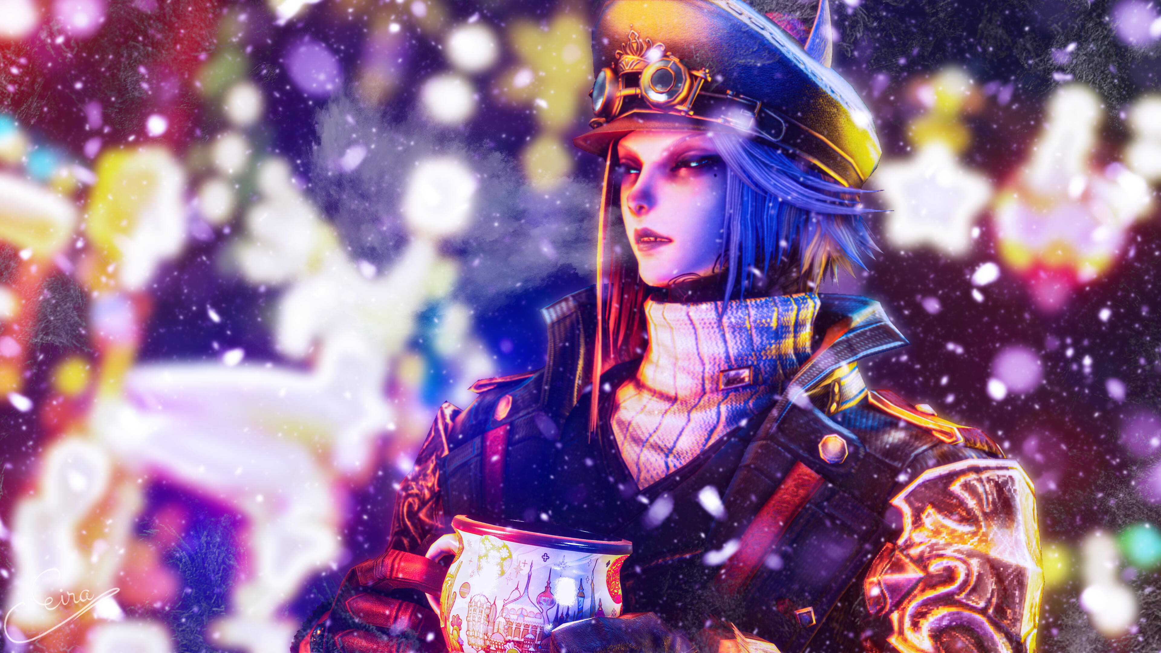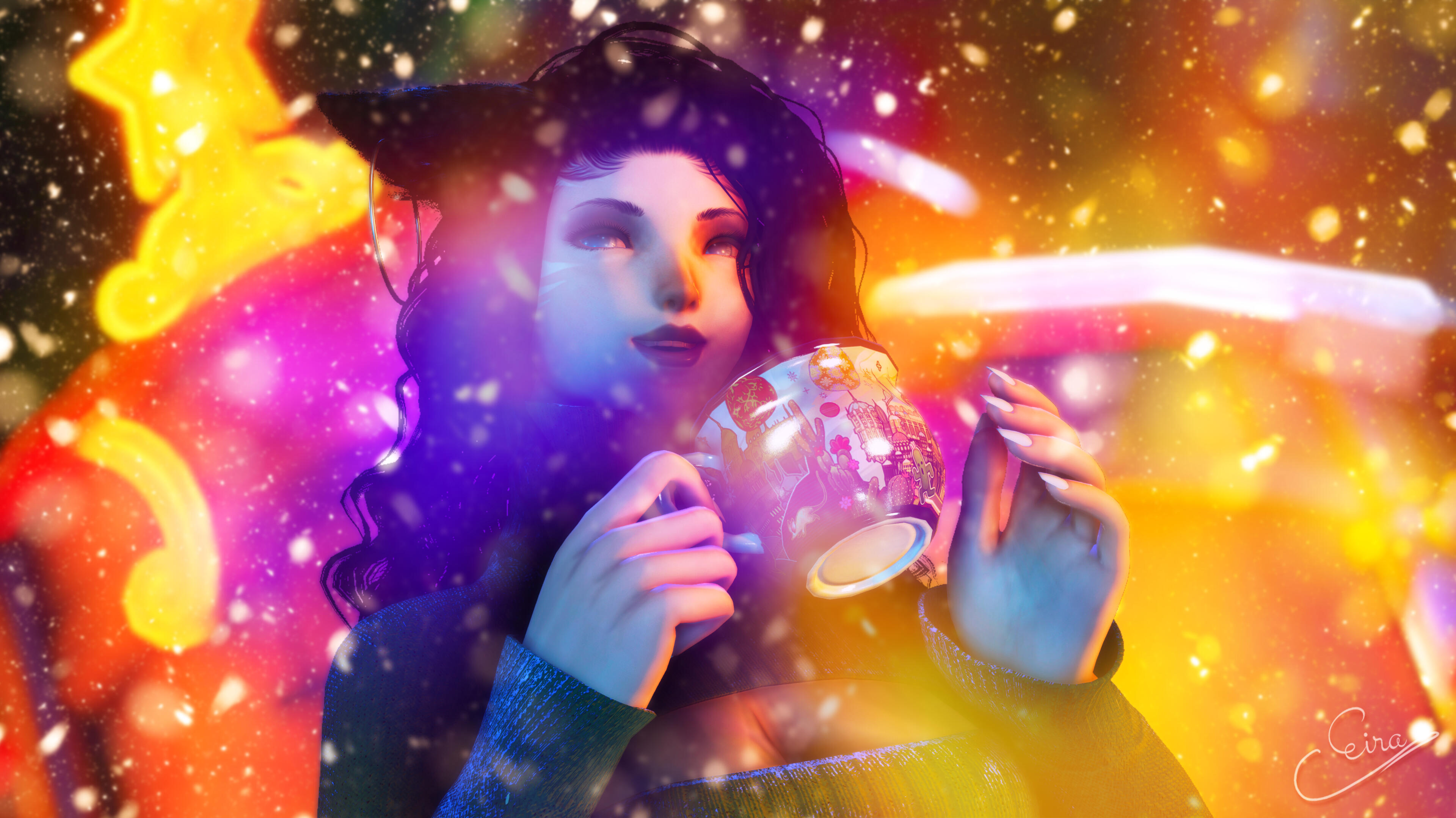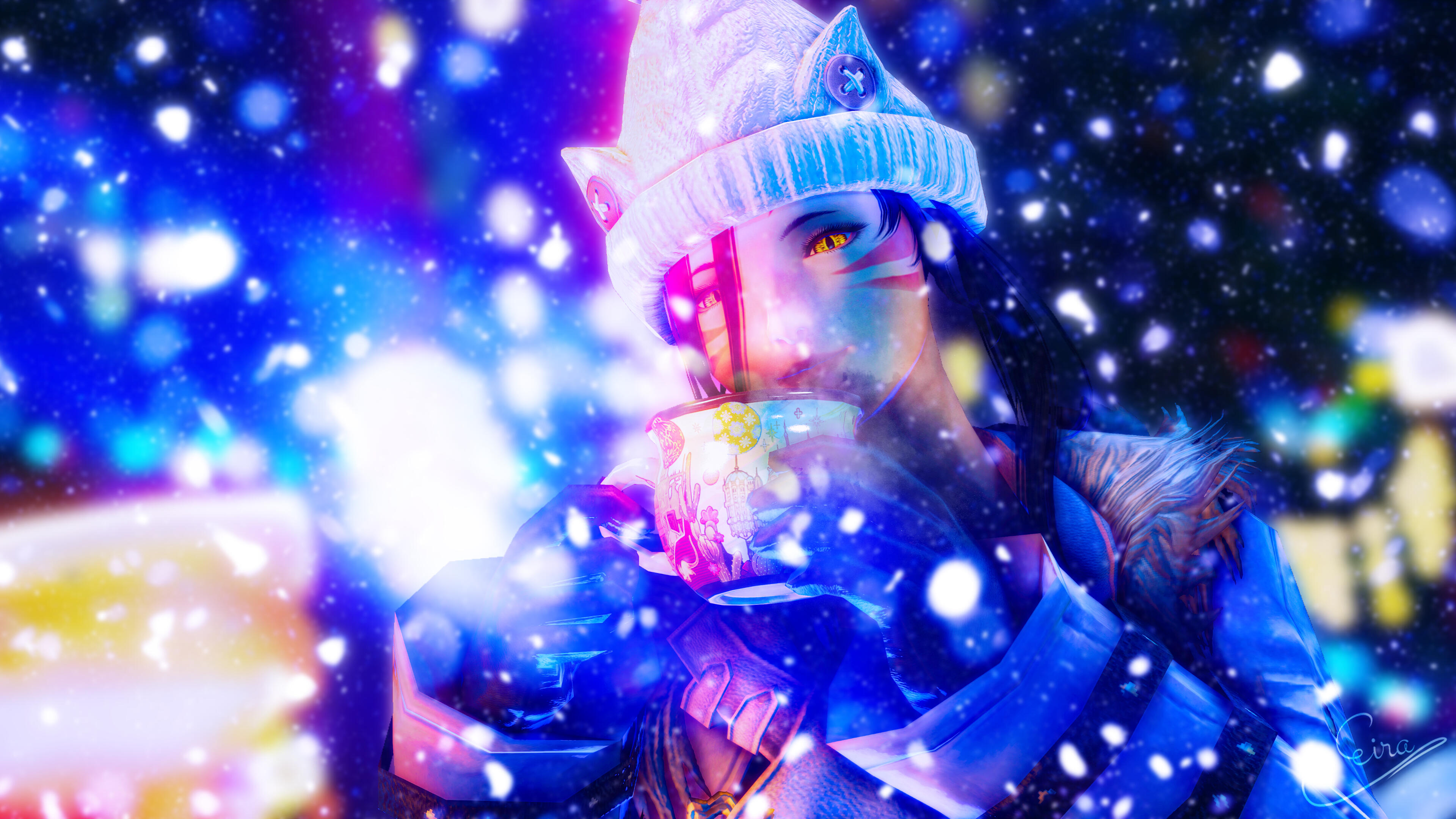 A cozy picture featuring snowfall, a hot drink, and bokeh-style background lighting.Pick between 3 mugs: Gridania, Limsa Lominsa, and Ul'dah!!!Only until the end of December!!