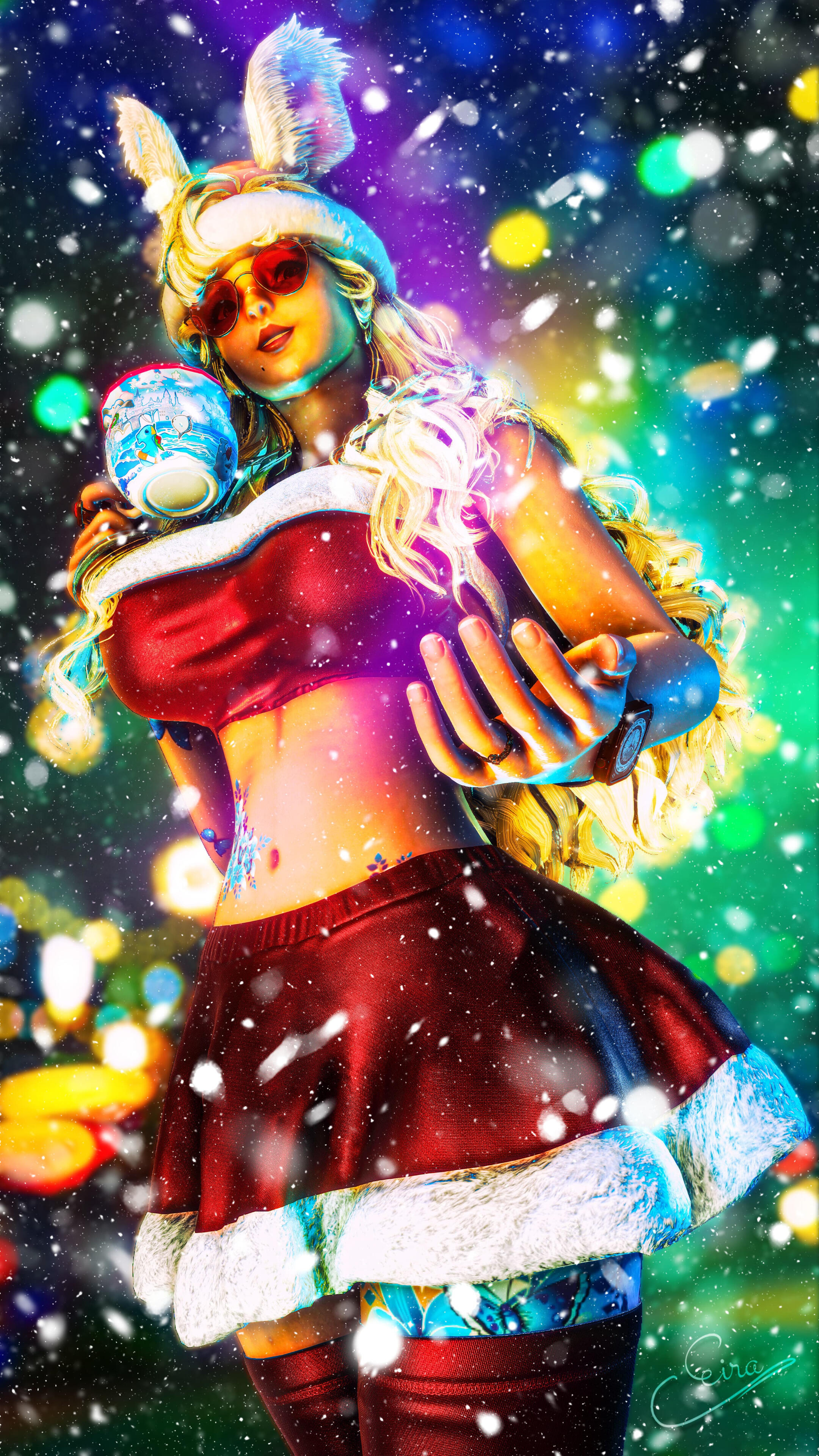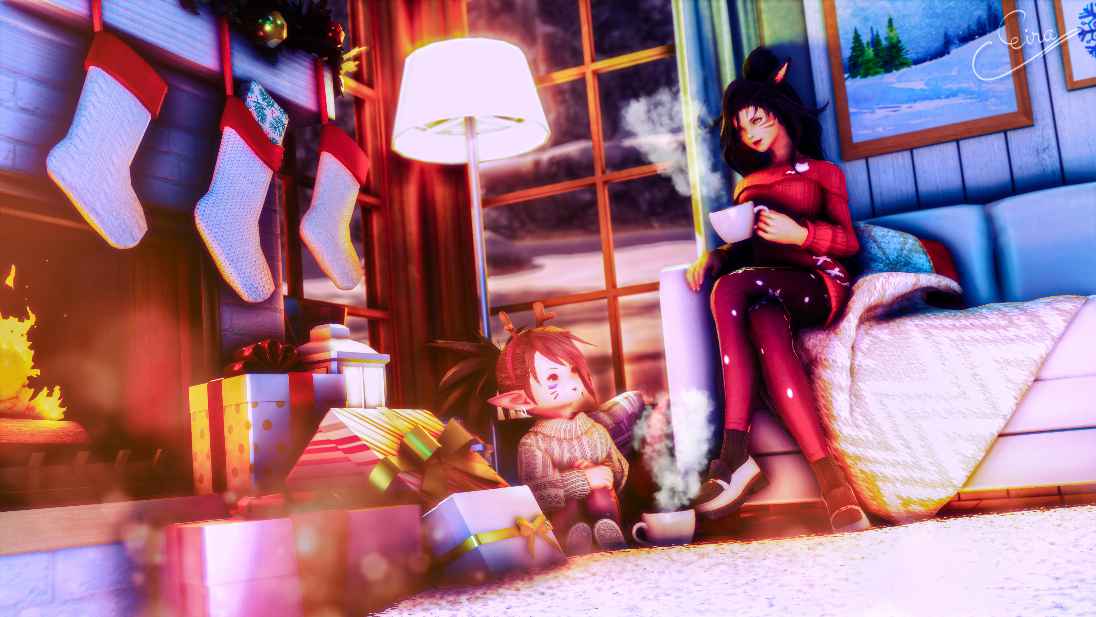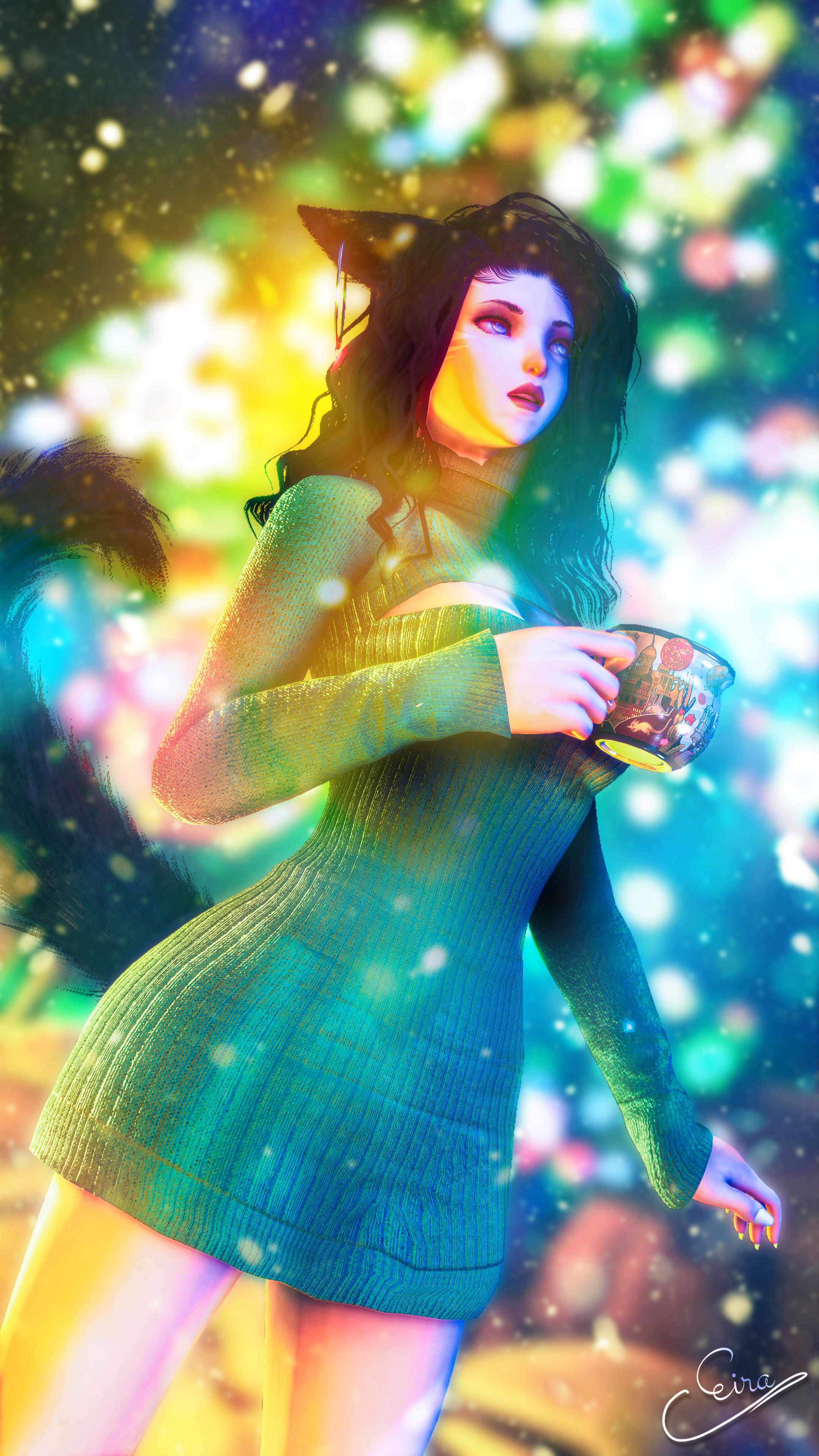 A cozy picture featuring snowfall, a hot drink, and bokeh-style background lighting.Pick between 3 mugs: Gridania, Limsa Lominsa, and Ul'dah!!!Only until the end of December!!